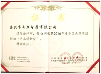 嘉興市奇力電器有限公司做為吊頂行業(yè)公認的“十大品牌”和中國建筑裝飾裝修材料協(xié)會天花吊頂材料分會常務副會長單位,應邀參加了這次盛會。公司憑借優(yōu)異的研發(fā)團隊和在吊頂產品創(chuàng)新中取得的不俗成績,榮獲2016年度中國天花吊頂行業(yè)“產品創(chuàng)新獎”。