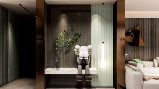 黑色波浪板在巖紋板與木紋板之間時尚過渡,這樣搭配出來的沙發(fā)背景墻,既擁有肌理的細(xì)節(jié),還給空間帶來了層次感與節(jié)奏感。